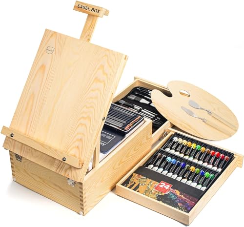 MIAOKE Bordstaffli i trä, justerbar resväska staffli med 55 delar, lyxig målarväska innehåller 24 st akrylfärger, 12 färgpennor, 10 penslar och andra verktyg