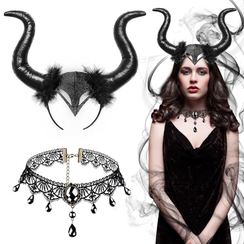 JOYUE 2 stycken drottning horn djävul huvudbonad & gotiskt halsband spets halloween onda hårband svart huvudbonad horn maleficent kostym kvinnor för karneval maskerad halloween cosplay fest