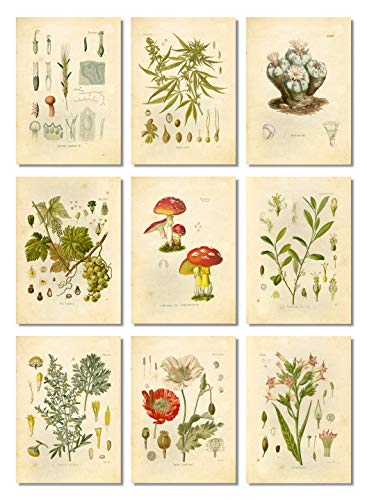 Ink Inc. Psykoaktiva hallucinogena växter botaniska ritningar vintage konsttryck, set med 9, 12,7 x 17,8 cm, oramad, cannabis Coca Opium Poppy Tobak Malört Druvor LSD Svamp Peyote