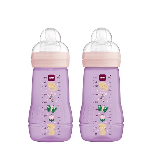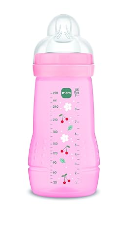 MAM Flaskflaska 2–4 månader, 270 ml, med napp 2 med medium silikonflöde, lätt att hålla, lätt att rengöra, MAM Easy Active, varmrosa, 1-pack