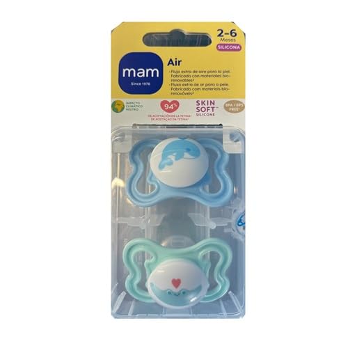MAM Air S231 Napp - Sköld med extra stora hål för känslig hud, med Skinsofttm ultramjuk silikonnippel, för spädbarn 6+ månader, blå, med självsteriliserande låda, 2 enheter