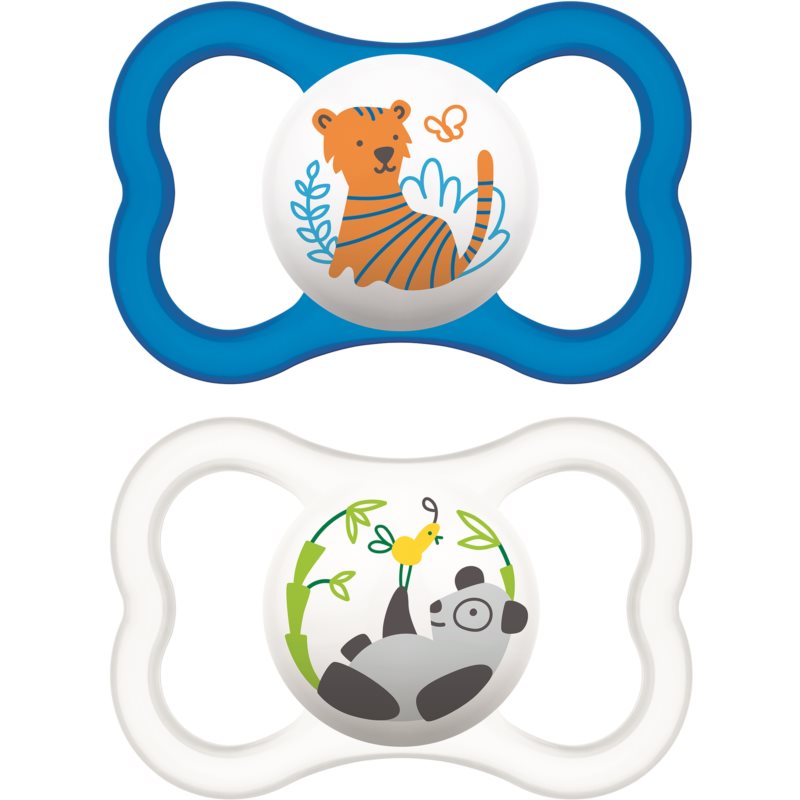 MAM Air Silikonnapp i set om 2, extra lätt och luftig skölddesign, tandvänlig babynapp gjord av speciell MAM SkinSoft silikon med nappbox, 16+ månader, fågel/tiger