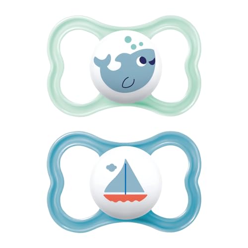 MAM Dummy med ventilerad sköld som lyser i mörkret, från 16 månader, med symmetrisk napp, platt och flexibel, lätt att använda, med självsteriliserande låda, MAM Air, mattblå, 2 stycken