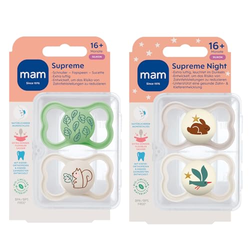MAM Supreme Dental Dummy 16 månader Plus, 4-pack för 16+, tunn napp – ortodontisk nå, hudvänlig med extra luftflöde, inkl. steriliserings- och transportbox