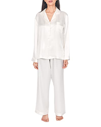 Sleepdown 100% silke dam pyjamas långt set 2 st - nattkläder sovkläder, bekväma, naturligt allergivänliga - 22 mamma, Elfenben, L