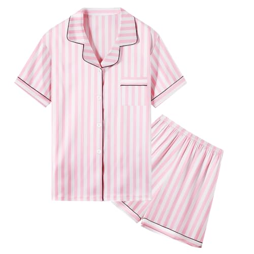 Umeyda Pyjamasset i satin för flickor och kvinnor, 2 st långärmade silkeslena pyjamas + sovbyxor för mamma, pojkar och pojkar, Baby rosa, L