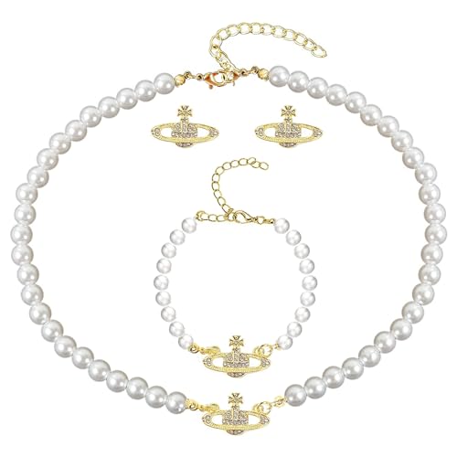 Damer Saturn Pärlhalsband Set - 3 Stycken Med Armband och Örhängen - Planet Smycke Present Till Fru Flickvän Mamma Dotter