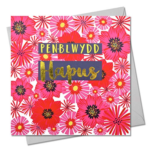 Welsh Welsh Happy Birthday gratulationskort, blommor, text Foiled i glänsande guld, öppen, för honom, för henne, vän, mamma, pappa, son, vän, syster, bror, penna-blwydd Hapus