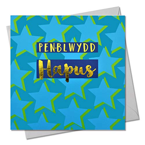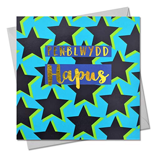 Welsh Welsh Happy Birthday gratulationskort, stjärnor, text Foiled i glänsande guld, öppen, för honom, för henne, vän, mamma, pappa, son, vän, syster, bror, pennblwydd Hapus