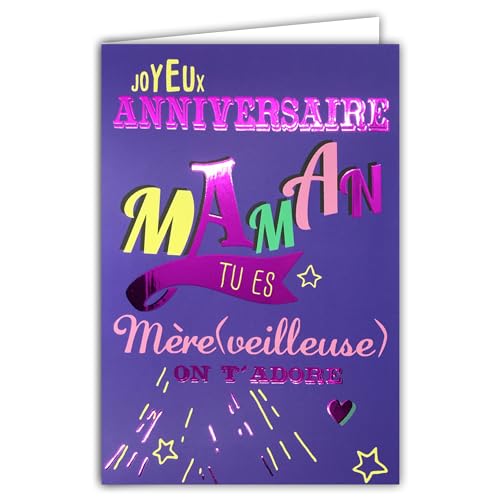 69-9035 Glad födelsedagskort för mamma mamma underbar "We love you" text bokstäver i glänsande fuchsia rosa + kuvert 12 x 17,5 cm - vit interiör - skapelse tryckt fransk tillverkning