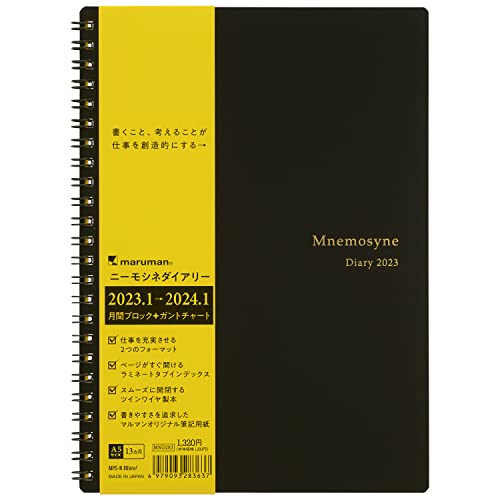 Maruman MNEMOSYNE Månatlig dagbok 2023, Månadsplanerare med flikar, 20,27 x 5,83 tum (A5), 1 ea (MND283-23), Svart
