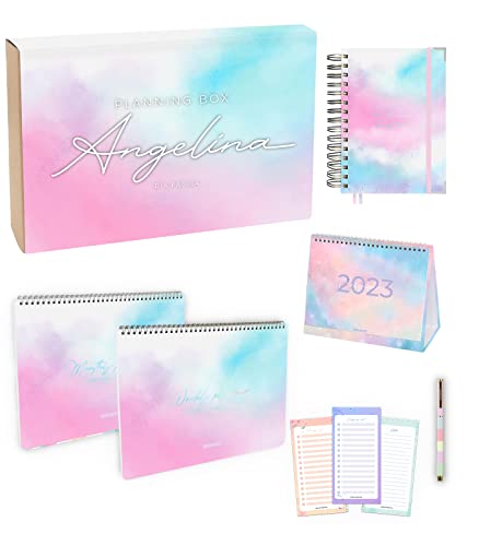 Takenote - Planeringslåda – planerare 2023 dag sida – presentförpackning – inkluderar årlig planerare, vecko- och månadsplanerare, 2023 bordskalender, checklista och penna – Angelina
