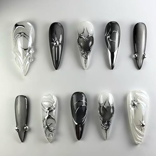 MouyouGlow Press på nagelkort kort, mandel svart silver fransk 3D hjärta wavy krom kattöga stjärnor magnetisk gotisk halloween falska naglar med nagellim, silver spetsar svarta konstgjorda naglar