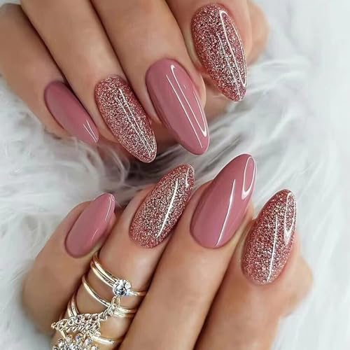 GlamRays 24 st mandel tryck på naglar medium falska naglar rosa lösnaglar med design glitter naglar glänsande akrylnaglar fulla naglar