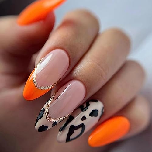 24 st falska naglar, medium, mandel, ballerina, akryl, tryck, glänsande naglar, full täckning, konstgjorda ovala naglar, fäst på naglarna, för kvinnor, flickor (rosa orange)