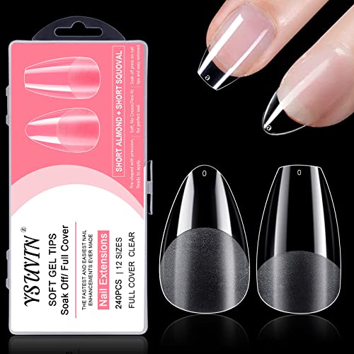 YSUVIN Nageltips 240 stycken falska naglar genomskinliga, 12 storlekar kort mandel och kort fyrkant, konstgjorda nagelspetsar naglar tips för nageltekniker, nybörjare, manikyrsalonger