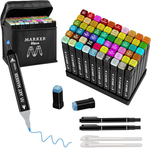 Banral 80 färger markörer – filtpennor set – permanent markörpenna med dubbelspets pennor snabbtorkande filtpennor med bärväska förvaringsbas för nybörjare, markera, skissa, rita, manga (60 färger)