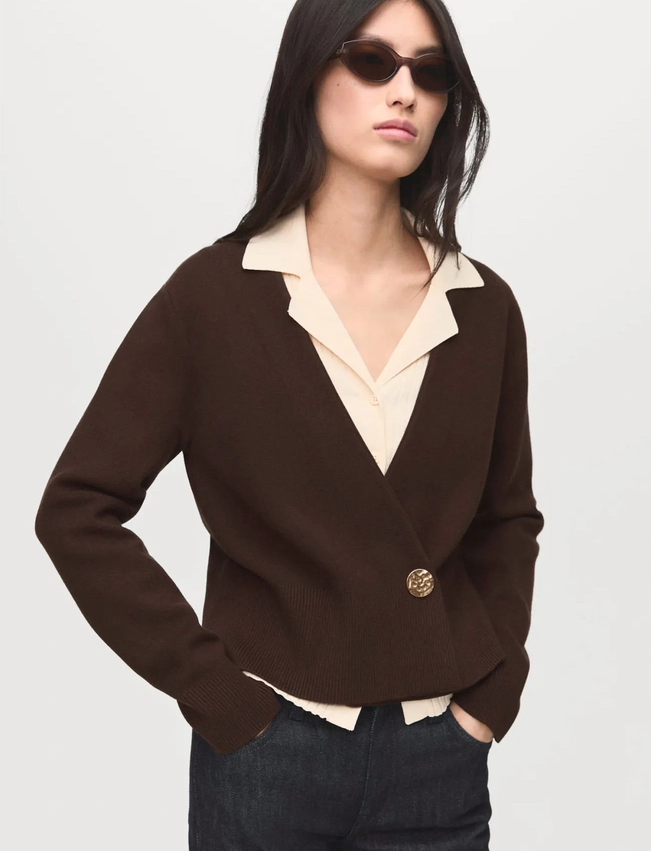 Mango Cross-Over Cardigan With Jewel Button - Brown - XS