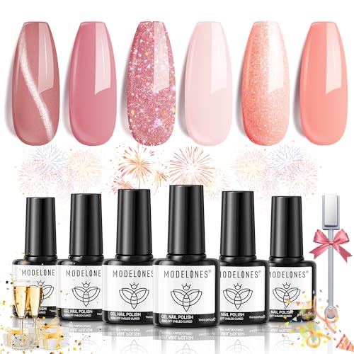 Modelones UV-nagellacksset – 6 färger gel med magnet, kattöga rosa naken glitter blötläggning – fransk manikyr gör-det-själv hemma