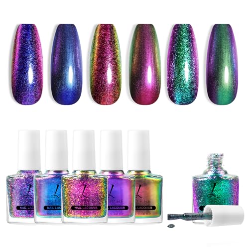 LOPHE Glitter nagellacksset, 6 st holografiska glitter reflekterande, snabbtorkande skimrande nagellack för gör-det-själv nagelkonst manikyr hemma, ingen nagellampa krävs