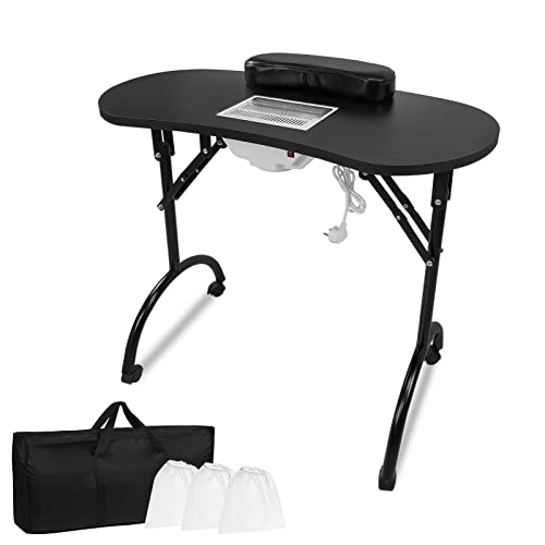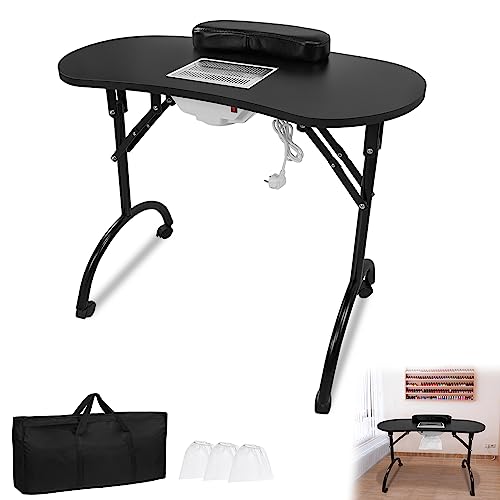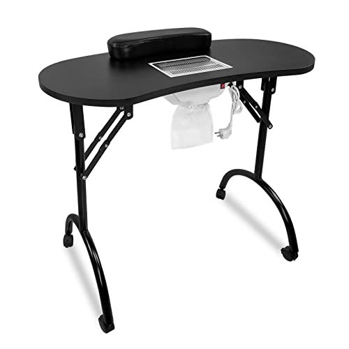 XMTECH Manikyrbord med sugning, vikbart nagelbord, manikyrbord, bärbart manikyrbord, mobila manikyrbord med hjul, dammpåse, bärväska, svart