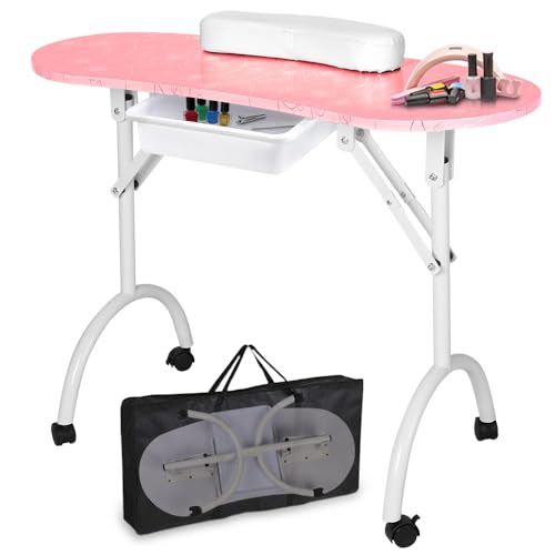 LEIBOU Professionellt 8 cm L bärbar och vikbar manikyrbord, nageltekniker, skrivbord, arbetsstation manikyrbord med rullande hjul, låda, svamp, gratis bärväska (rosa mönster)