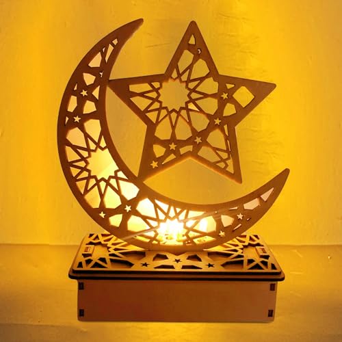 Eid Mubarak Ramadan dekorationslampa, Ramadan LED-lampa, Eid Mubarak nattlampa i trä, träbordsdekoration månlampa, muslimsk Eid Ramadan nattlampa, lämplig för Eid Mubarak gåvor fester dekorationer (A)