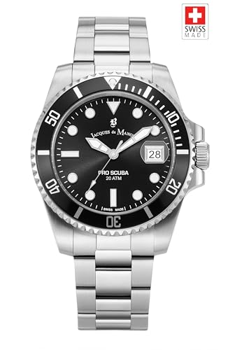 Jacques Du Manoir Pro Scuba, mäns dykklocka, kvarts analog, rostfritt stål, 43 mm, rostfritt stål armband, silver, 20 bar, urtavlans färg: Svart, datumvisning, JWG02801
