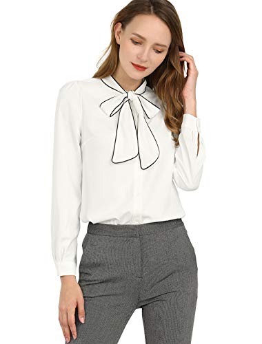 Allegra K kvinnors Elegant lavalliere-rosett Blus Manschett Långärmad knyt framdel skjorta vit 20