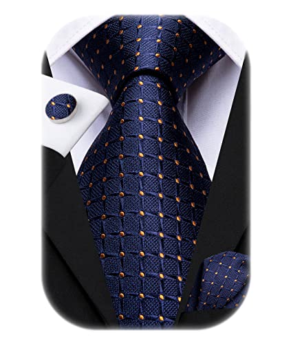 Hi-Tie Slips set för män fyrkantig näsduk och manschettknappar vävd siden formell klassisk slips för affärer bröllopsfest, Blå guld pläd, M