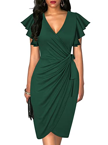 oten Dam djup V-hals volang ärm mantel vardaglig cocktailparty arbete falsk wrap klänning, mörkgrön, medium, Mörkgrön, M