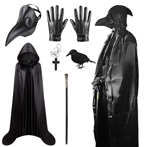 Abitoncc Plague Doctor kostym vuxen plågläkare mask, svart mantel med huva, läderhandskar, kråka rekvisita, steampunk läder lång näsa fågelmask för halloween plague doktorsmask kostym vuxna kvinnor