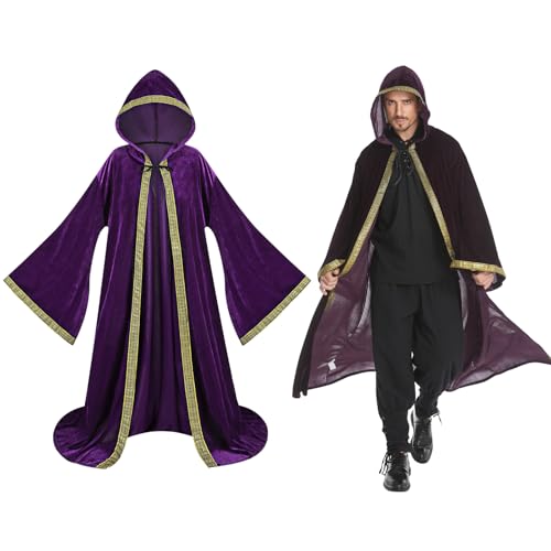 maxToonrain Mystisk trollkarl rock full längd sammet mantel med huva bred ärm stil vuxen medeltida retro vintage renässansdräkt maskeraddräkt för halloween maskerad (lila 142 cm)