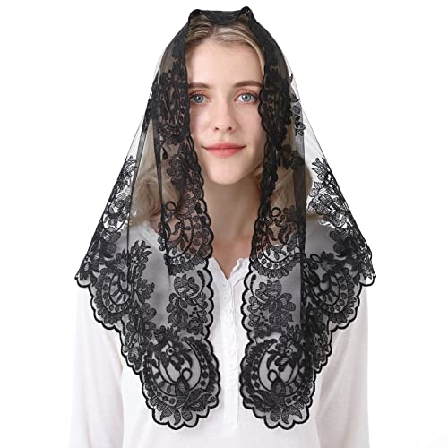 Grettytling Lace Mantilla Veil Soft and comfortable 7 Colors Spanish Style Rose Lace Veil Head Covering D Shape (2pcs Black&white)