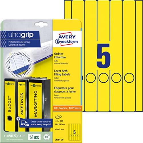 Avery Zweckform L4750-20, mappetiketter för smala mappar långa, t.ex. för Leitz Elba Esselte Mehle Herlitz ben 38 x 297 mm 20 ark