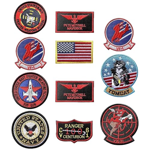 XoeLLe Förpackning med 11 USA-flagga Maverick-lappar broderade, topppistol strykbara lappar, flygvapnet marin arméjacka taktisk militär logotyp dekorativ applikation för kläder jacka jeanskeps