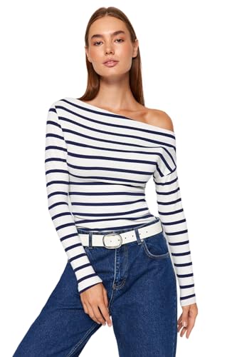 Trendyol Dam Ung Anpassad Standard Rund hals Stickad Blus, marinblå, M