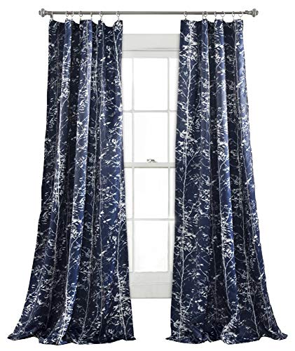 Lush Decor Gardiner med botaniskt trädgårdsmotiv, tryck med blommor och fåglar, ljusfiltrerande, för vardagsrum, matsal och sovrum, set med ett par, 132 x 241 cm, marinblå