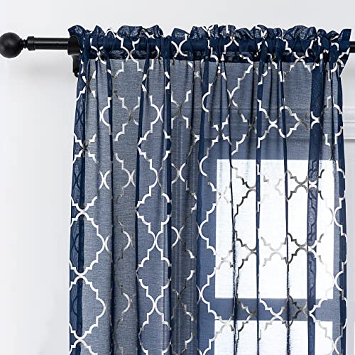 Kotile marinblå marockanska gardiner för sovrum – metalliskt silverfolie gitter mönster geometriska genomskinliga draperier stång ficka fönsterbehandling gardin panel 150 cm längd, 132 x 153 cm, 2