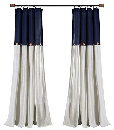 Lush Decor Fönstergardin i linne, med knappar, enkelpanel, 102 B x 213 cm L, marinblå och vit, lantliga gardiner, rustik dekor, färgblock, moderna bondgårdsgardiner för vardagsrum, sovrum och matsal