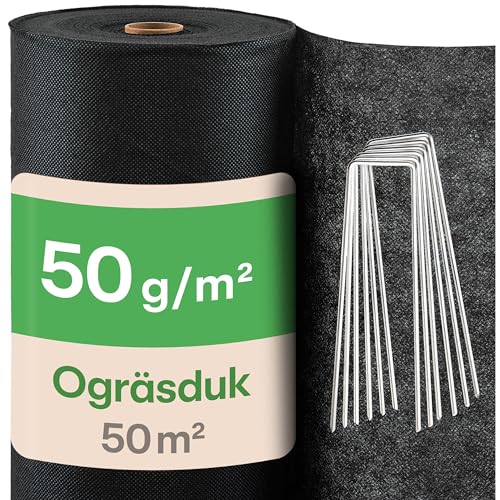 Praknu Ogräsmatta 50g/m² – Trädgårdsduk med 24 Markspik | 50m² – Vattenpermeabel, UV-beständig & Rivstark – Markduk för Blomrabatter & Säsongsväxter