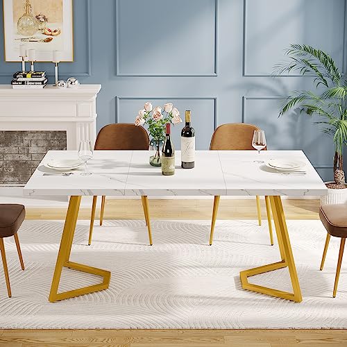 Tribesigns Modernt gyllene matbord, 140 x 80 cm vitt köksbord med guldfärgade metallben, konstgjord marmor, litet matrum köksbord för 4–6 personer, rektangulärt matbord för lägenhet