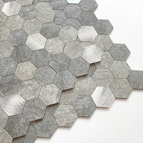 MOFIT Hexagon-skala av och klistra fast stänkplattor, kök, självhäftande metall och marmor vaxkaka, skala av och klistra fast väggplattor, klistermärke, mosaik värmebeständig (grå, 10 ark)