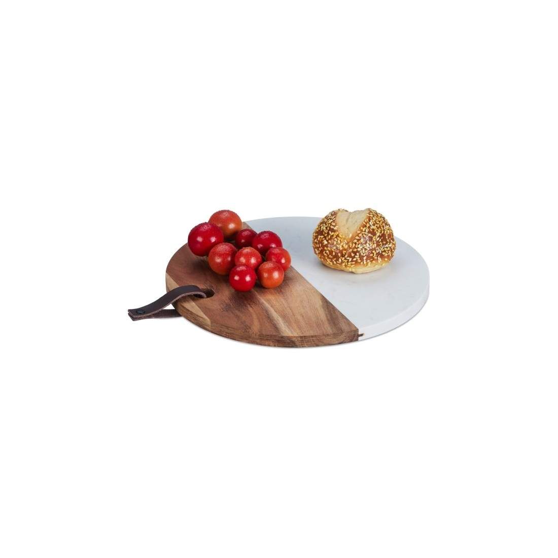 Relaxdays Skärbräda rund, marmor och trä, köksbräda, H x D: 1,5 x 25 cm, frukostbräda, för upphängning, natur/vit