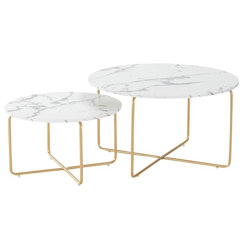 Liink1Ga Marmorsoffbord vitt runt marmorbord för vardagsrum, soffbord rund uppsättning om 2 soffa sidobord soffbord rund med champagne gyllene ram (konstgjord marmor)