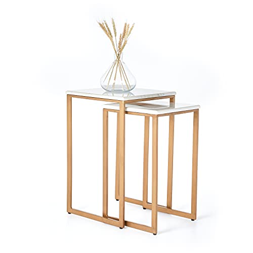 Penguin Home Uppsättning av 2 vita marmorbord med robusta guldmålade metalljärn rektangulära ben stilfulla moderna soffbord sovrum vardagsrum kontor |storlekar-38x38x61 cm och 33x33x56 cm|