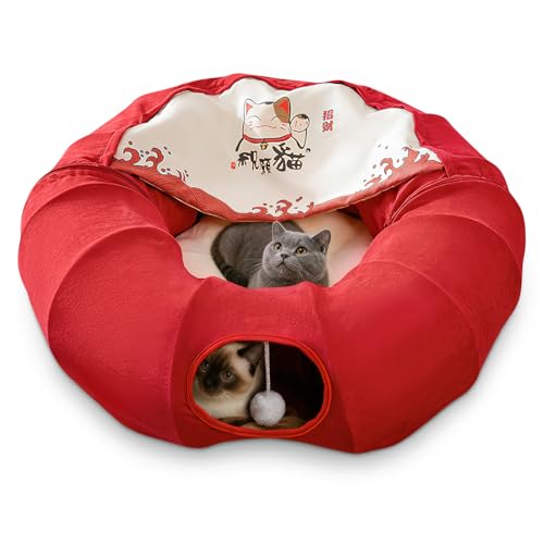 ALLSOPETS Cats Tunnel Bed 2 i 1 Rund hopfällbar Cat Tunnel Leksak Kattsäng med 1 hängande repbollar Inomhus Cat Tunnel för katt Kattungar Kanin marsvin Röd