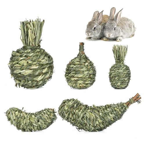 Djowyh gräsboll kanin boll leksak paket med 5 leksaker för marsvin, kanin tandvård mat, lämplig för marsvin, kaniner, chinchilla, hamstrar, ren