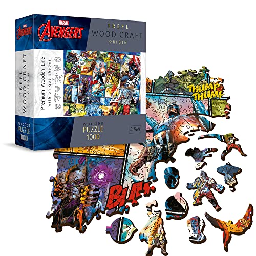 Trefl - Träpussel: Marvel Comic Universe - 1000 element, Wood Craft, träslöjd, oregelbundna former, 100 figurer och attribut av superhjältar, Premium pussel, för vuxna och barn från 12 år och uppåt
