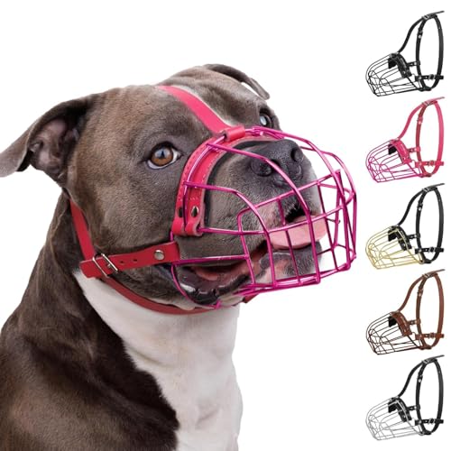 BRONZEDOG Pitbull Dog Muzzle Metal Mask Amstaff Wire Basket Pit Bull Adjustable Leather Straps for Large Dogs (Pink)